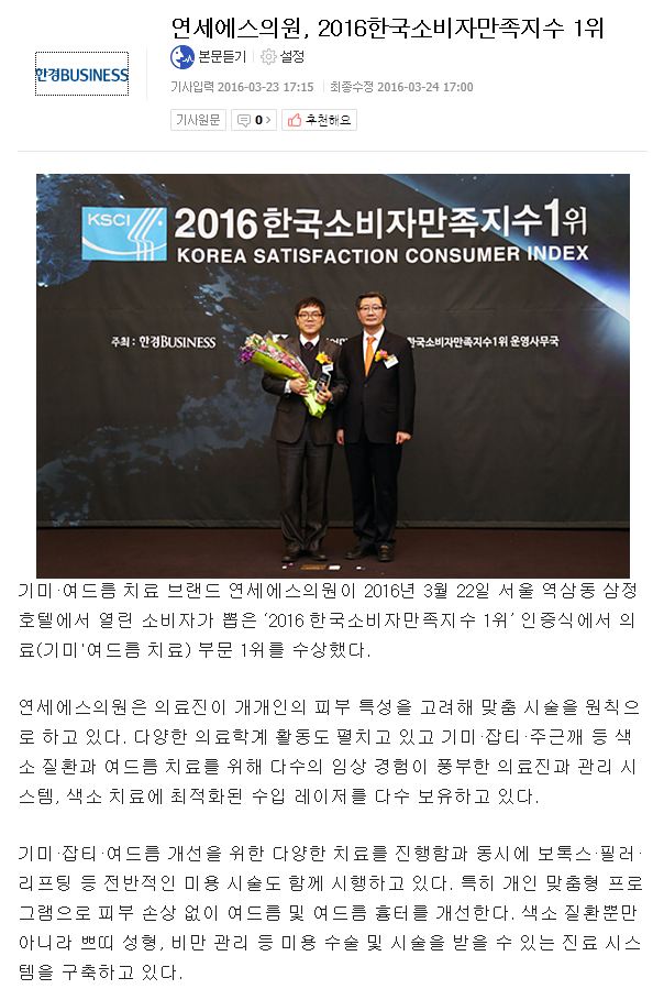 인쇄하기/글자확대.축소 기본 크게 더크게 인쇄 스크랩 목록보기 한경BUSINESS 연세에스의원, 2016한국소비자만족지수 1위 페이지 정보 작성자연세S클리닉 작성일2016-07-07 18:36:43 조회3,476 댓글0 본문 인쇄하기/글자확대.축소 기본 크게 더크게 인쇄 스크랩 목록보기 이전글 ▲[기자탐방] 김상민 원장이 말하는 기미, 여드름 피부관리법 다음글 ▼2016년 6월 옐로우아이디 당첨자 안내!! 댓글목록 등록된 댓글이 없습니다. 이전글 다음글 목록보기